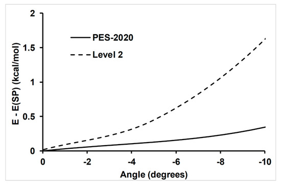 where and are, respectively, the energies with PES-2020 and Level 2 for the same calculated points. The RMSE was 2.08 kcal mol−1, which was reasonable given the complex topography of the reactive system, where the appearance of deep wells in the entrance and exit channels made their correct location difficult.