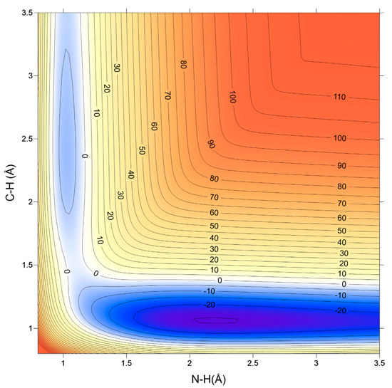 Schematic 2D representation of the PES-2020 surface describing the reactive system of CN + NH3 as a function of the broken and formed bonds, N–H and H–C, respectively, in Å. The other internal coordinates were fixed at the values in the saddle point. Energies are shown in kcal·mol−1. The reactant and product complexes appear clearly in the entrance (upper-left zone) and exit (lower-right zone) channels in the plot.