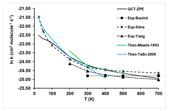 There is an extensive literature regarding experimental temperature dependence for the title reaction. In 1981, Baulch et al. [9] reviewed the previous experimental data and showed that the rate constant was independent on temperature in the range of 300–700 K, with the expression k(T) of 1.66.10−11 cm3 molecule−1 s−1. Later, Sims and Smith [10,11] reported rate constants in the temperature range of 294–761 K, fitted to the expression k(T) of 1.52 10−11exp(1.50/RT), and at lower temperatures of 25–295 K, fitted to the expression k(T) of 2.77.10−11(T/298)−1.14, in cm3 molecule−1 s−1; to the best of our knowledge, this presents the only experimental evidence at low temperatures. They found that at temperatures T > 300 K, rate constants present little dependence with temperature, while at temperatures T < 300 K, rate constants strongly increase when temperature decreases. This behavior is characteristic of fast, barrierless reactions with a stabilized intermediate complex in the entrance channel. Finally, in 1995, Yang et al. [1] reported rate constants in the range of 294–716 K, fitted to the expression k(T) of 10−11.02 exp(254/T), in cm3 molecule−1 s−1, which are lower than those reported by Sims and Smith [10]. For instance, at 700 K, the values are 1.37.10−11 versus 1.97.10−11 cm3 molecule−1 s−1; i.e., differences of about 40%. This difference diminishes when the temperature decreases.