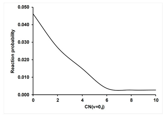 In this section, we analyze the role of CN rotational excitation on reactivity, using as an example the temperature at 300 K (other temperatures show a similar tendency and are not presented here). Figure 5 plots the variation of the probability of reaction, Pr = Nr/NT, Equation (5), as a function of the rotational quantum number, CN (v = 0, j = 0–10). This probability strongly decreases when j increases in the range of j of 0–6, while at the larger range of j of 8–10, the probability practically remains constant. We believe that when the CN reactant is rotationally excited, less time is necessary to obtain the adequate orientation for collision and therefore, fewer reactive trajectories are obtained. In summary, rotational excitation produces a disorienting effect [53,54,55,56] in the entrance channel, which in this particular reaction, with a deep well in this channel, was enhanced.