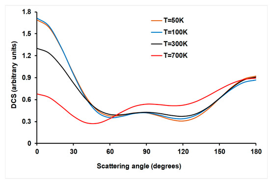 Product angular distribution is an additional test of the existence of a complex mechanism for the title reaction. It is known that forward–backward angular scattering distributions are associated with the presence of persistent complexes along the reaction path [57]. The QCT/PES-2020 angular distributions of the HCN product with respect to the CN reactant were obtained as a differential cross section (DCS) which was fitted by the Legendre moment method [58]. The scattering angles at different temperatures are plotted in Figure 6. They show a forward-backward behavior at all temperatures, with a more forward tendency at low temperatures, which changes to a more backward tendency at higher temperatures. This behavior is associated to the presence of deep wells along the reaction path due to the presence of stabilized complexes. A similar forward–backward behavior was found by our group when studying the Cl(2P) + NH3 and OH + NH3 reactions [59,60], all which were characterized by persistent complexes in the entrance and exit channels. These wells produce a disorientation effect by which the initial trajectories lose the memory of the initial impact.
