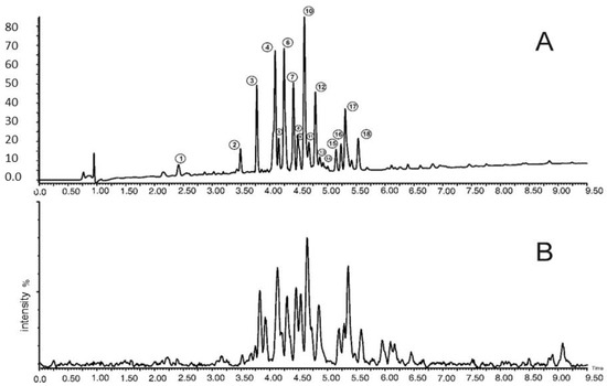 UPLC−PDA−MS/MS chromatogram of phenolic compounds of Primula veris L. dried flower extracts. A: PDA chromatogram at 254 nm; B: MS base peak chromatogram.