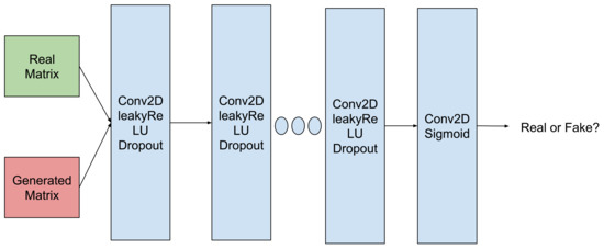 The basic model we investigate for its ability to generate realistic tertiary protein structures is the one proposed recently in [14,15]. We refer to this model as Vanilla GAN. D in Vanilla GAN combines several Conv2D, LeakyReLU, and Dropout layers together to discriminate against training/input and generated data, as shown in Figure 2. As we detail later in this section, our data are distance matrices.
