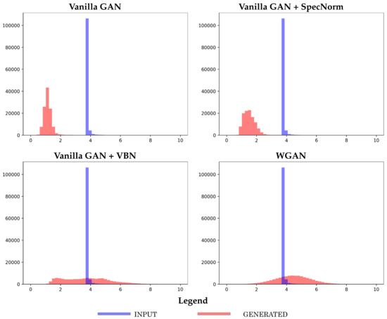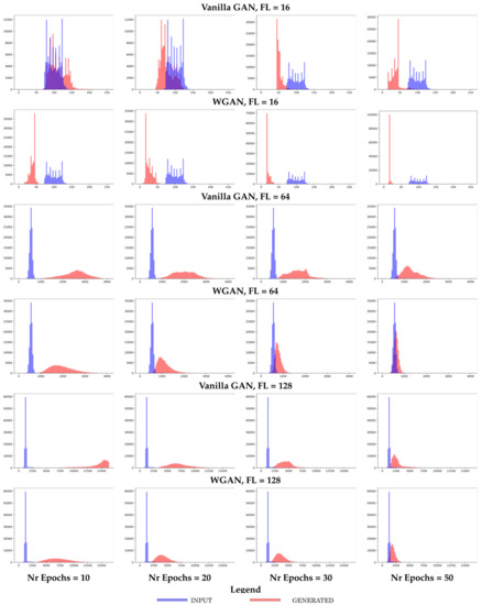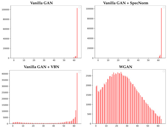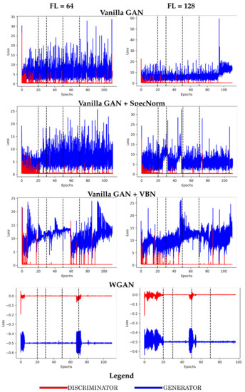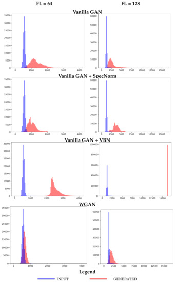 Experiments were conducted using the Pytorch framework on 2 Tesla V100 GPU’s in parallel. For Vanilla GAN, the learning rate is set to for both D and G, as in [14]. Binary cross entropy is used as the loss function, and the Adam optimizer is used with beta values of (0.5,0.999). Training times over one training epoch vary from s to 146 s. Specifically, considering the FL = 6 and FL = 128 as providing the range and training over one epoch results in – s for Vanilla GAN, – s for Vanilla GAN + SpecNorm, – s for Vanilla GAN + VBN, and – s for WGAN.