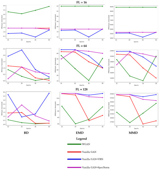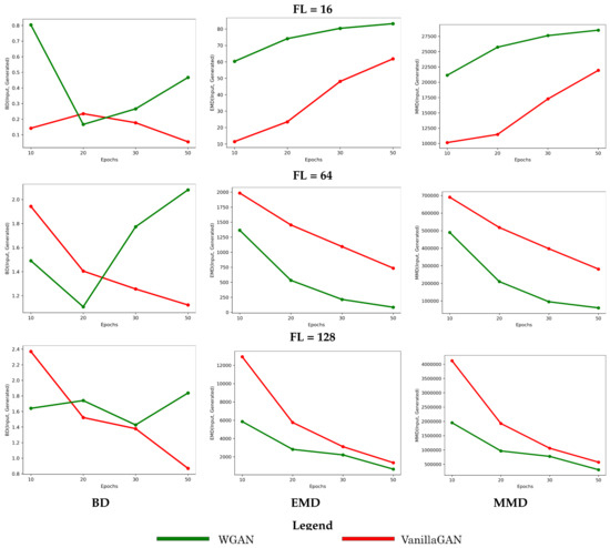 Figure 10 allows drawing the same observations from the visual analysis in Figure 9. The divergence of the models (higher in its rate for WGAN over Vanilla GAN) is obvious with the growing number of epochs on the shorter-length dataset (FL = 16). The improvement of the quality of the generated dataset with longer training is obvious for both models on the longer-fragment datasets (FL = 64 and FL = 128). While the improvement is more drastic (higher rate of change) for Vanilla GAN, WGAN reaches lower distances overall at each arrest point (over training epochs). Incidentally, this analysis also shows that the results obtained with BD are not as intuitive to interpret; in contrast, EMD and MMD are more robust.
