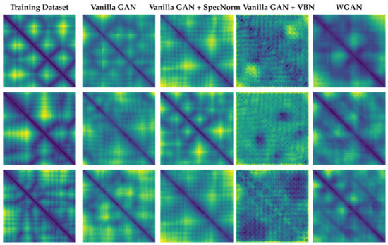 Figure 11 shows the presence of the backbone in the distance matrices generated by Vanilla GAN, Vanilla GAN + SpecNorm, and WGAN. This is visible as a dark line along the main diagonal. In contrast, the distance matrices obtained by Vanilla GAN + VBN lack such structure. Overall, the presence of some additional structure is visible in the distance matrices generated by all the models. Darker regions can be seen off the main diagonal. The distance matrices generated by each of these models, however, vary in quality. In contrast to the other models, Vanilla GAN + VBN yields very atypical distance matrices that do not resemble protein-like ones (compare with the left panel). Portions of the backbone are missing, and many off-diagonal regions are dark, indicating that a large number of the CA atoms are proximal. The distance matrices obtained by WGAN contain more realistic long-range structure off the diagonal that resembles what is observed in protein tertiary structures (as shown for reference in the leftmost panel).