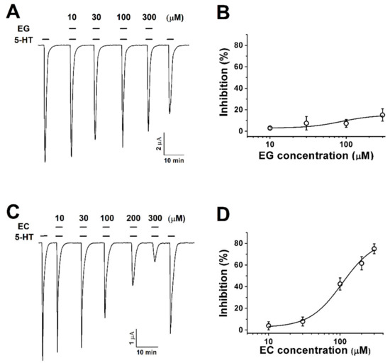 Oocytes expressing human 5-HT3A receptors were exposed to various concentrations of ergonovine (EG) or chanoclavine (EC) and 100 µM 5-HT. The co-application of ergonovine with 5-HT did not show any noticeable reduction and no change in the current as the concentration increased (Figure 2A,B). In contrast, chanoclavine induced a lower current than the treatment with 100 µM 5-HT alone and showed a reduced rate of about half at the same ratio of 5-HT and EC (Figure 2C,D; half-maximal inhibitory response concentrations (IC50) = 107.2 ± 22.8). Figure 2C,D shows the dose-dependent effect of chanoclavine. The maximum inhibition (Imax) was 83.6 ± 12.6%, and the inhibition of I5-HT was 4 ± 3.8%, 7.9 ± 4.1%, 42.5 ± 5.7%, 61.6 ± 6.1%, and 75 ± 4.5% at 10, 30, 100, 200, and 300 µM, respectively, in oocytes expressing the 5-HT3A receptor (n = 8–10 from four different frogs).