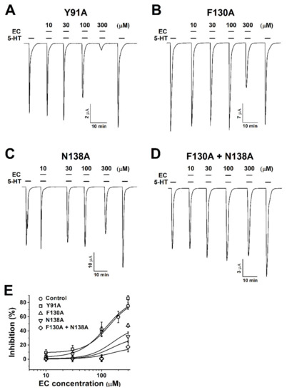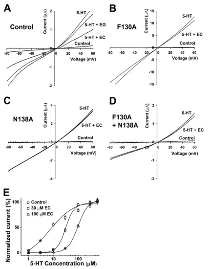In this experiment to study the relationship between the current and voltage, the membrane potential was held at −80 mV, and traces were obtained by ramping from −80 to +60 mV over a duration of one sweep per two seconds using the voltage ramp protocol. Before the 5-HT treatment (Figure 4A, control), the current from the exposure to the bathing solution alone was insignificant in negative and positive voltages (both were near −0.1 and +0.1 µA). In oocytes flowing with the bath solution and 5-HT, 5-HT evoked more inward and outward currents than the control, and their reversal potential was close to 0 mV. Figure 4A−D represents the currents of the wild-type h5-HT3A and the F130A, N138A, and F130A+N138A mutants. The currents of the mutants treated with 100 µM 5-HT and EC were similar to the treatment with 100 µM 5-HT alone, whereas the current of the control group decreased. The wild-type 5-HT3A voltage ramp current activated by 5-HT and EC was inhibited 42.5 ± 2.3%, 40.9 ± 1.1%, 47.9 ± 3.4%, and 49.5 ± 4% at −60, −30, +30, and +60 mV holding potential, showing that the 5-HT3A inward current was independent upon the holding potential voltage.