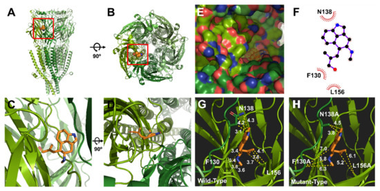The covalent docking protocol was used to predict the amino acid residues involved in the interaction of chanoclavine with the 5-HT3A receptor. A docking simulation was used to analyze the potential binding locations and perform the modeling required for the accurate binding energy calculations of chanoclavine with the 5-HT3A receptor. The homology models with mutants F130A and N138A were built on the template of the wild-type 5-HT3A receptor. Only those residues whose interaction function was confirmed to be lost through point mutation and a two-electrode voltage clamp were considered for atomic distances using Pymol (Figure 5G,H). The template known as the human 5-HT3A receptor used in BLAST showed 98.6% identity and was selected as a suitable template (ID code 6Y1Z, 2.82-Å resolution). The molecules were modeled through movements such as twisting, angle, and rotation at the binding site. The modeling structure of chanoclavine was simulated in the 5-HT3A receptor to show the best-fitting position (Figure 5). Figure 5 shows that chanoclavine is docked in the binding pocket area on the extracellular side of the 5-HT3A receptor (Figure 5A,B). The docking results of Figure 5C,D are: Binding Energy = −4.59 kcal/mol, Intermolecular Energy = −5.79 kcal/mol, Torsional Energy = 1.19 kcal/mol, Unbound Extended Energy = −0.54 kcal/mol, and refRMS = 231.78). The inverse logarithm of inhibition constant was pKi = 3.37. The most ideal docking conformation indicated that chanoclavine could form strong hydrogen bonds with the wild-type 5-HT3A receptor. However, in the mutants, each residue replaced with alanine had a weaker binding than the wild type. F130, N138, and L156 residues were used as interacting site residues (F130 distance = 3.4, 3.8, 3.4, and 3.6 Å; N138 distance = 3.1, 4.2, and 4.3 Å; and L156 distance = 3.7, 3.8 and 4.1 Å in the wild type and F130A distance = 7.0, 5.8, and 6.3 Å; N138A distance = 3.8 and 4.5 Å; and L156A distance = 5.2 and 6.1 Å in the mutant type). The mutant type appears to increase considerably the interatomic distance and decrease the number of possible bonds compared to the wild type. However, the currents of all the other 5-HT3A mutants showed no effect from chanoclavine (Figure 3 and Table 1). Y153 plays a critical role in the binding and gating of serotonin and antagonists (granisetron, etc.) at the binding pocket of 5-HT3A, because tyrosine can make the hydrogen bond with the ligand [25]. When comparing our results with the binding sites of existing papers [26,27], chanoclavine is a competitive inhibitor that acts on the same binding pocket. However, F130 and N138 are the key residues for binding, not Y153 (Table 1 and Figure 3). In conclusion, chanoclavine binds to the same binding pocket as the existing agonists and antagonists, but chanoclavine interacts with the novel residues F130 and N138, which are different from those of the well-known residues (I71, Y91, Y153, I228, etc.) [26,27].