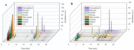 Trinh stated that aloe-emodin, chrysophanol, rhapontigenin, and rhaponticin were isolated from the RU extracts and their fractions []. Nevertheless, our study identified chrysophanol, emodin, and physcion to be the major compounds in the RU extracts. The concentrations of these compounds were particularly high in n-Hex, EtOAc, Ac, and EtOH solvents. Similar to previous studies [,], our study found chrysophanol, emodin, and physcion in the RC extracts. Furthermore, a comparable trend has documented that the water extract of RC showed the lowest value of pure compounds []. From these results, which are consistent with those of a study by Lee [], it is clear that pure compounds are extracted mostly in nonpolar and moderately polar solvents, such as n-Hex, EtOAc, and EtOH.