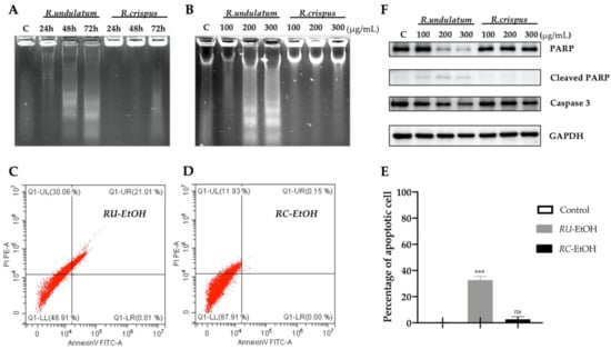 RU, not RC, induces significant apoptosis responses in human hepatocellular carcinoma cell line HepG2. DNA fragmentation using agarose gel electrophoresis of DNA isolated from HepG2 cells treated with either RU-EtOH or RC-EtOH (A,B). Annexin V-FITC/PI flow cytometric shape of HepG2 cells, 48 h post-treatment of the ethanol extracts of RU (C) and RC (D). Compared with negative control (DMSO), apoptotic percentage of the total cell population was presented and given as mean ± SD (n = 3) *** p < 0.0001; ns: not significant (E). Effects of different concentrations of RU-EtOH and RC-EtOH on the protein expression responsible for apoptosis in HepG2 cells. GAPDH was used as an internal control (F).