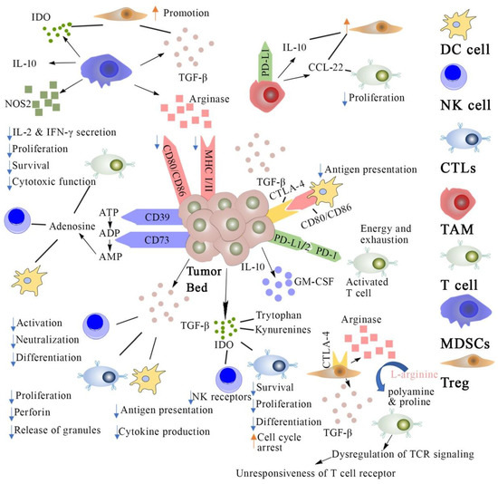 Cancer immunosuppression mechanisms and strategies for cancer immunotherapy. DC cell: dendritic cells; NK cell: natural killer cell; CTLs: cytotoxic T lymphocytes; TAM: Tumor-associated macrophage; MDSCs: myeloid-derived suppressor cells; Treg: regulatory T cell; TCR: T cell receptor; IL: interleukins; PD-L1: programmed death cell ligand 1; PD-1: programmed death cell receptor; MHC: major histocompatibility complex; IDO: indoleamine 2,3-dioxygenase; GM-CSF: granulocyte macrophage colony stimulating factor; ATP: adenosine triphosphate; ADP: adenosine di-phosphate; NOS: nitric oxide synthase; TCF: transforming growth factor.