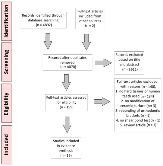 This systematic review was accomplished in accordance with the PRISMA (Preferred Reporting Items for Systematic Reviews and Meta-Analyses) guidelines used to collect and report data [44,45]. It was conducted in an attempt to answer the following questions: (1) Does surface conditioning significantly influence the bond strength of dental ceramics to dental tissue? (2) Which surface conditioning method can most effectively improve the bond strength of dental ceramics to dental tissue? (3) What are the other factors (e.g., artificial aging, luting cement) that significantly influence the bond strength of dental ceramics to dental tissue?