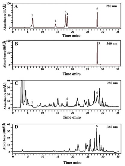 Chromatograms obtained in the HPLC-photo diode array (PDA) analysis of Diels aqueous extract (TTE). HPLC chromatograms of standard solutions at (A) 280 nm, (B) 360 nm, (C) TTE sample at 280 nm and (D) TTE sample at 360 nm using the solvent gradient program, as shown in Supplementary Table S2. Peaks: 1, gallic acid. (6.45 min); 2, catechin (14.52 min); 3, (–)-epigallocatechin gallate (17.63 min); 4, epicatechin (18.35 min); 5, quercetin (28.15 min).