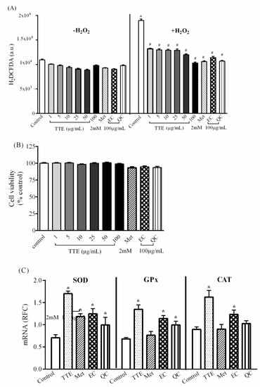 To evaluate the antioxidant effects of TTE on intracellular reactive oxygen species (ROS), the fluorescent dye 20,70-dichlorfluoresceindiacetate (H2DCFDA) (Sigma-Aldrich, St. Louis, MO, USA) was used, as previously described [30]. HepG2 cells were seeded at 2 × 105 cells/mL in 96-well plates and grown for 3 days. Cells at 80–90% confluence were pretreated with different concentrations of TTE (1–100 µg/mL), 100 µg/mL EC and QC or 2 mM metformin for 24 h. Subsequently, the cells were washed and incubated with 10 µM H2DCFDA for 1 h at 37 °C in the dark. H2O2 (0.5 mM) was then added to each well and incubated for another 30 min. At the end of the experiment, the cells were washed twice, and intracellular ROS was measured using a SynergyTM HT microplate reader at an excitation wavelength of 495 nm and an emission wavelength of 527 nm.