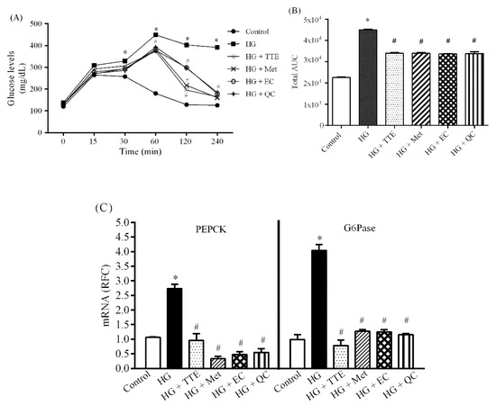 The inhibitory effect of TTE on hepatic glucose production in HepG2 cells. Cells were incubated with or without a medium containing 5 mM glucose (HG) for 24 h. Subsequently, HG cells were treated with 20 mM sodium lactate and 2 mM sodium pyruvate for another 240 min. (A) The glucose levels in the media in each condition, including HG cells treated with 100 µg/mL TTE (HG + TTE), HG cells treated with 2 mM metformin (HG + Met), HG cells treated with 100 µg/mL epicatechin (HG + EC), and HG cells treated with 100 µg/mL quercetin (HG + QC) were determined using a commercial colorimetric assay. (B) Total area under the curve was calculated from (A). (C) Phosphoenolpyruvate carboxykinase (PEPCK) and G6Pase mRNA expression from each condition were measured using quantitative real-time PCR (qPCR). The results are reported as RFC and expressed as mean ± SEM (n = 5). * p < 0.05 vs. the control group, # p < 0.05 vs. the HG group.