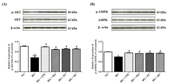A previous study has shown that the activation of Akt/AMPK inhibits the expression of the hepatic gluconeogenic enzymes, PEPCK and G6Pase [4]. We, therefore, further investigated the effect of TTE on phosphorylation of Akt and AMPK signaling pathway using Western blot analyses. As shown in Figure 4, the phosphorylation of AMPK (Thr172) and Akt (Ser473) was significantly decreased in the HG group when compared with the control. On the other hand, treatment of HepG2 cells with TTE at 100 µg/mL increased the phosphorylation of AMPK and Akt compared with HG cells; similar effects were seen with EC, QC, and metformin treatment. These data suggest that TTE, mainly via EC and QC, is able to improve hyperglycemia, insulin resistance, and hepatic gluconeogenesis, similar to the effects of metformin.