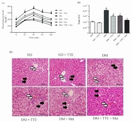 The effect of TTE on glucose intolerance in type 2 diabetic (T2DM) rats. Blood glucose levels were measured at the basal level and after glucose loading (1 g/kg BW) for 120 min. (A) Plasma glucose levels were determined using a commercial colorimetric assay. (B) Total area under the curve (AUC) from (A). Data are expressed as mean ± SEM (n = 6), * p < 0.05 vs. the ND group, # p < 0.05 vs. the T2DM group. (C) Micrographs of conventional hematoxylin and eosin (H&E) staining of the liver tissues. The liver from each experimental group was removed, fixed, embedded, cut, and stained by H&E (original magnification 100×). The assay was performed at least three times on separate sets of animals. The data were then analyzed using bright-field microscopy. White arrow indicates inflammation, dilation in the central vein, fibrosis, and leukocytic infiltration around the central vein. Black arrow indicates fat vacuoles in liver tissues.