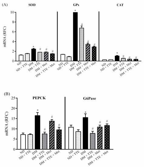 The effect of TTE on genes involved in antioxidant status and hepatic gluconeogenesis in T2DM rats. mRNA expression levels of (A) copper-zinc superoxide dismutase (Cu-ZnSOD), glutathione peroxidase (GPx), and catalase (CAT) and (B) PEPCK and G6Pase from ND, ND + TTE, DM, DM + TTE, DM + Met and DM + TTE + Met in rat liver. Results are reported as RFC and expressed as mean ± SEM (n = 5). * p < 0.05 vs. the ND group, # p < 0.05 vs. the DM group.