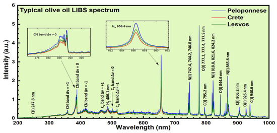 Due to the elemental composition of the major constituents of olive oil, the corresponding olive oil LIBS spectrum is expected to be dominated by the characteristic spectral features of elements such as hydrogen, oxygen, and carbon. As an example, in Figure 1, the atomic emissions of these elements are shown. As can be seen, a typical LIBS spectrum of an olive oil sample consists of atomic emissions of hydrogen’s Balmer series lines, Hβ at 486.1 nm and Hα at 656 nm, Oxygen O(I) spectral lines at about 777 nm, 844.6 nm, and 926.4 nm, Nitrogen N(I) spectral lines at 742 nm, 818 nm, and 865.6 nm, and Carbon C(I) spectral lines at 247.8 nm, 795.2 nm, 906.2 nm, and 940.6 nm. In addition, some molecular bands were also observed arising from molecular species formed under plasma conditions, for example, some bands corresponding to CN and C2 molecules. So, the molecular bands of the CN system were clearly observable at about 360 nm, 388 nm, and 422 nm, and attributed to the Δν = +1, Δν = 0 and Δν = −1 vibrational sequences. Also, the C2 Swan bands system appeared clearly at about 470 nm, 516 nm, and 559 nm, and attributed to the Δν = +1, Δν = 0 and Δν = −1 vibrational sequences. These molecules do not exist as independent molecular entities in olive oil, but they are either formed following some complicated chemistry paths under plasma conditions and/or can result from the fragmentation of larger organic molecules (e.g., fatty acids, etc.) present in the olive oil.