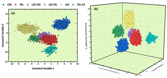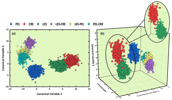 The resulting 2D and 3D LDA graphs are displayed in Figure 6a,b, respectively. From inspection of Figure 6a, only three clusters seem to be clearly distinguishable, corresponding to the Cre, Les, and Pel–Cre samples, while the formation of a fourth cluster containing the Pel, Les–Pel, and Les–Cre samples is noticeable as well. However, this overlapping disappears in the 3D LDA graph of Figure 6b, where only some overlap between the Pel and Les–Pel samples is observable. The estimated cross-validation accuracy reached a value of (100 ± 0.0)%. Again, the inconsistency between the high estimated accuracy and the overlapping shown in the 2D and 3D LDA plots, as mentioned previously, is due to the limited capabilities of visualization by such plots and the five PCs used for training purposes.