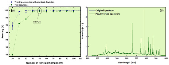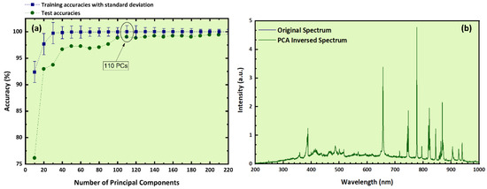 (a) Training and test accuracies as a function of the number of PCs, (b) experimental LIBS spectrum and PCA-inversed spectrum.