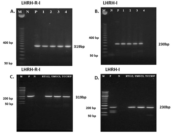 Representative RT-PCR analysis of mRNA for LHRH-I and LHRH-R-I in human bladder tumor specimens and three bladder cancer cell lines. (A,C) The PCR products were of the expected size of 319 bp for LHRH-R-I; (B,D) The PCR products were of the expected size of 230 bp for LHRH-I). Lane M, molecular marker (50-bp DNA ladder); Lane P, positive control (human pituitary tissue); Lane N, no template control; Lanes 1–4 (A,B) representative human bladder cancer specimens; Panels (C,D) representative human bladder cancer cell lines (RT-112, UMUC3, and TCCSUP).
