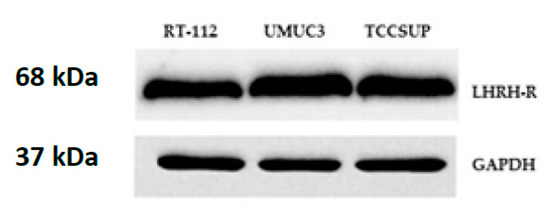 For cell lysate preparation, RT-112, UMUC3, and TCCSUP bladder cancer cells were washed with ice-cold phosphate-buffered saline (PBS). Afterwards, the cells were scraped from the flasks and lysed in ice-cold M-PER protein lysis buffer (Thermo Fisher Scientific, Waltham, MA, USA), supplemented with protease and phosphatase inhibitors (Sigma-Aldrich, St. Louis, MO, USA). Protein quantification of cell lysate was performed using BCA reagent (Thermo Fisher Scientific, Waltham, MA, USA). All the samples were diluted with 4× Laemmli buffer. Equal amount (40 μg) in equal volume of each protein sample was boiled at 95 °C for 8 min. Corresponding to the molecular weight of the target protein, the lysates were separated on 10% sodium dodecyl sulfate–polyacrylamide gel by electrophoresis (SDS-PAGE). As a molecular weight marker Precision Plus Protein Kaleidoscope Standard (BioRad Laboratories, Irvine, CA, USA) was used (Figure S4). The proteins were transferred to polyvinylidene fluoride (PVDF) membrane (Millipore, Burlington, MA, USA). Upon blocking with 5% milk-TBS-Tween, membranes were incubated with primary antibodies (overnight, 4 °C): anti-LHRH-R, 1:200 dilution (sc-13944 rabbit polyclonal; Santa Cruz Biotechnology Inc., Dallas, TX, USA), anti-GAPDH, 1:1000 dilution (D16H11 rabbit monoclonal; Cell Signaling Technology, Danvers, MA, USA). Incubation with primary antibodies was followed by HRP-tagged anti-mouse IgG secondary antibody (Thermo Fisher Scientific, Waltham, MA, USA). The signal was detected by chemiluminescence. Intensity of each band was normalized to GAPDH.