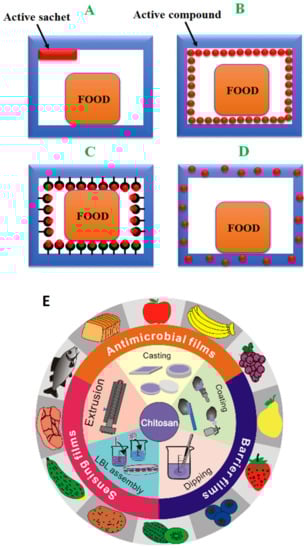There are several designs for active packaging (AP) inside a food package (Figure 1), such as the following: (A) using the active sachets (oxygen and moisture absorbers, and ethanol vapor generators), (B) coating an active compound (heat-sensitive active agents or those incompatible and immiscible with the polymer matrix) onto the polymer, (C) immobilizing the active compound on the polymer surface (the presence of functional interacting groups on both the active agent and the polymer is necessary). The strong bonding of active compounds onto polymers allows slow release into the food, and (D) direct incorporation into the polymer matrix, which ensures high resistance to processing conditions of the polymer, no adverse effect on the polymer properties, and slow release to food. Use of bioactive polymers, such as chitosan, exhibits inherently antimicrobial activity in composites or coating (E) [8,9].
