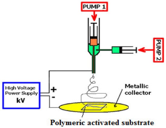 Electrospinning, a modern technology, produces polymer nanofibers containing active compounds for the development of active food-packaging coating, encapsulation, and interlayer materials [226,227] with both antimicrobial and antioxidant activities [154,228,229]. The electrospinning technique facilitates the processing of the thermolabile substances. The basic set-up for electrospinning/electrospraying (Figure 2) consists of four main components: (1) a high-voltage source (1–30 kV), usually operated in direct current mode, though alternating current mode is also possible, (2) a blunt-ended stainless steel needle or capillary, (3) a syringe pump, and (4) a grounded collector in the form of a flat plate. The electrospraying process involves the application of a strong electrostatic field between two electrodes imposed on a polymer solution. When increasing the electrostatic field up to a critical value, charges on the surface of a pendant drop destabilize the shape of the solution from partially spherical to conical, i.e., the so-called Taylor’s cone effect. As the charged jet accelerates toward regions of lower potential, the solvent is evaporated [230]. Besides being a very simple technique, the solvent is evaporated at room temperature; thus, it constitutes an ideal method for protecting sensitive encapsulated ingredients.
