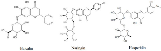 Chemical structures of flavonoids, baicalin, naringin, and hesperidin.