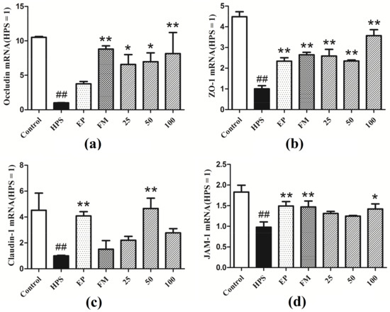 Expressions of tight junctions genes (a) Occludin, (b) ZO-1, (c) Claudin-1, (d) JAM-1 in the peritoneum of piglets challenged with G. parasuis (Mean ± SD, n = 3). HPS: G. parasuis group, EP:EP + G. parasuis group, FM:FM + G. parasuis group, 25:25 mg/kg baicalin + G. parasuis group, 50:50 mg/kg baicalin + G. parasuis group, 100:100 mg/kg baicalin + G. parasuis group. ## p < 0.01 vs control. * p < 0.05 vs G. parasuis group, and ** p < 0.01 vs G. parasuis group.