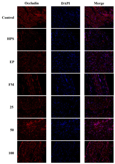 Effect of baicalin on the distribution patterns of Occludin in the peritoneum of piglets challenged with G. parasuis (magnification 10 × 40). HPS: G. parasuis group, EP:EP + G. parasuis group, FM:FM + G. parasuis group, 25:25 mg/kg baicalin + G. parasuis group, 50:50 mg/kg baicalin + G. parasuis group, 100:100 mg/kg baicalin + G. parasuis group.