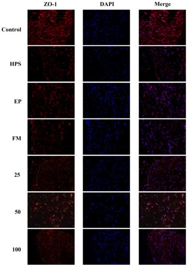 Effect of baicalin on the distribution patterns of ZO-1 in the peritoneum of piglets challenged with G. parasuis (magnification 10 × 40). HPS: G. parasuis group, EP:EP + G. parasuis group, FM:FM + G. parasuis group, 25:25 mg/kg baicalin + G. parasuis group, 50:50 mg/kg baicalin + G. parasuis group, 100:100 mg/kg baicalin + G. parasuis group.