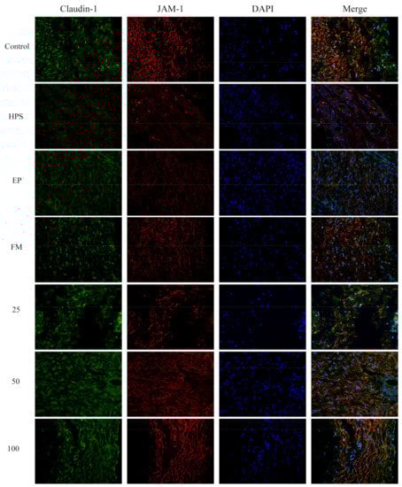 In addition to appropriate expression, proper organization and distribution of the tight junction proteins is critical for the maintenance of a permeability barrier. The G. parasuis mediated disruption of the distribution results of tight junctions proteins in peritoneum and the effect of each drug are shown in Figure 3, Figure 4, Figure 5 and Figure 6. As expected, G. parasuis infection alters the distribution of occludin, ZO-1, claudin-1 and JAM-1 in the peritoneum. We observed that occludin, ZO-1, claudin-1 and JAM-1 protein staining appeared to be reduced and more fragmented in the G. parasuis group. Administration with EP or FM could significantly prevent these abnormalities and maintain the continuous organization of tight junctions (p < 0.01). Treatment with 25, 50 and 100 mg/kg baicalin could significantly attenuate this disorganization (p < 0.01). Among all drug treatment groups, 50 mg/kg baicalin was demonstrated the best protection effect on the disruption of the distribution of tight junction proteins. These findings identify a G. parasuis-induced global impairment of tight junction integrity, a process largely prevented by baicalin supplementation.