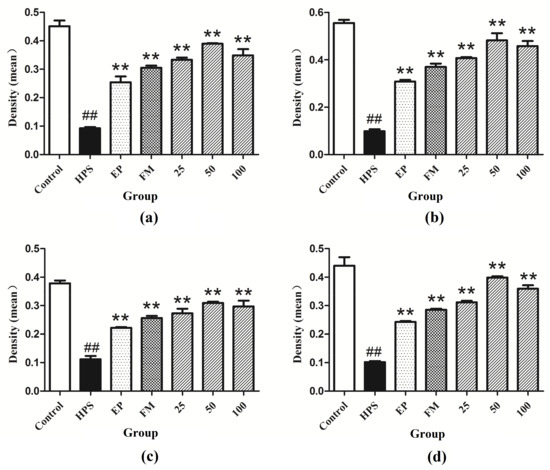 Fluorescence of (a) occludin, (b) ZO-1, (c) claudin-1 and (d) JAM-1 in peritoneum were measured by densitometric analysis using the software Image J. HPS: G. parasuis group, EP:EP + G. parasuis group, FM:FM + G. parasuis group, 25:25 mg/kg baicalin + G. parasuis group, 50:50 mg/kg baicalin + G. parasuis group, 100:100 mg/kg baicalin + G. parasuis group. ## p < 0.01 vs. control. and ** p < 0.01 vs. G. parasuis group.