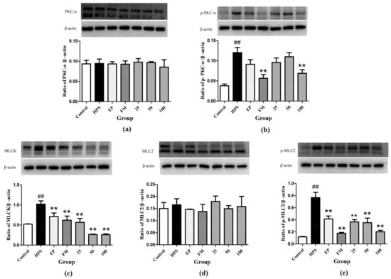 Western blot assays were carried out to determine whether the protective mechanism of baicalin on tight junctions of G. parasuis-infected piglets acts through the PKC and MLCK/MLC pathways. As shown in Figure 7a,b, G. parasuis infection significantly increased the phosphorylation level of PKC-α (p < 0.01), while the protein level of PKC-α remained unchanged (p > 0.05). EP, FM, and baicalin could down-regulate the expression of p-PKC-α induced by G. parasuis and have no effect on the expression of PKC-α.