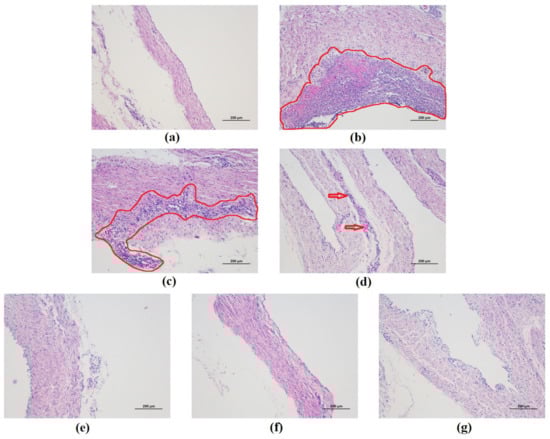 Histopathological change in the piglet peritoneum after G. parasuis infection (H&E, ×100). (a) control group, (b) G. parasuis group, (c) EP + G. parasuis group, (d) FM + G. parasuis group, (e) 25 mg/kg baicalin + G. parasuis group, (f) 50 mg/kg baicalin + G. parasuis group, (g) 100 mg/kg baicalin + G. parasuis group. Severe and moderate lesions were circled with red line. Mild lesions were pointed by red arrow.