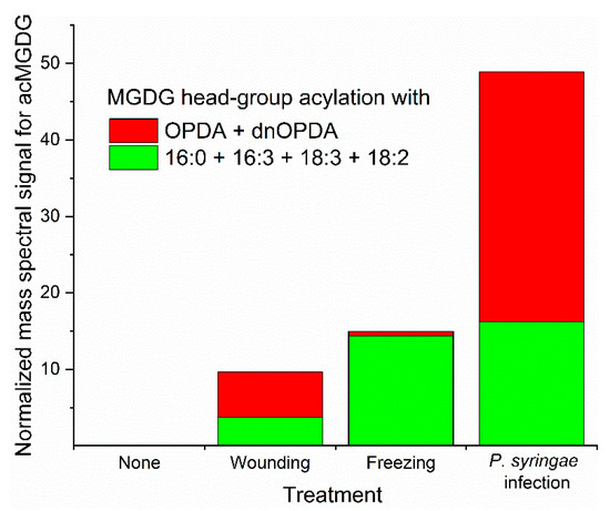 Arabidopsis thaliana accession Columbia-0 produces different acMGDG amounts and different molecular species when subjected to different stresses. Relative amounts of acMGDG head-group acylation by non-oxidized (16:0 + 16:3 + 18:3 + 18:2) (green) and oxidized (OPDA + dnOPDA) (red) on monogalactosyldiacylglycerol (MGDG) as a function of stress treatment. “Pseudomonas syringae infected” represents an avirulent infection at 24 h. Freezing was 2 h at −8 °C without acclimation and sampling after a 24 h recovery at 21 °C. Wounding was with a hemostat across the midvein and sampling 6 h later. Data are from reference 10.