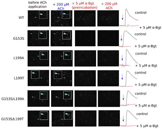 It is worthy to note that in the 96-well plate Ca2+ assay the receptors containing G153S mutation tend to show submaximal responses to high acetylcholine concentrations (see the rightmost points on Figure 4a,b). Such a type of apparent self-inhibition is well-known for nAChRs (e.g., [26,27]). However, the 96-well plate assay measures the integral signal from the entire well. Single-cell Ca2+ flux remains uncharacterized in such experiments. Complementary to dose–response curves obtained in a 96-well plate assay, the amplitudes of fluorescent signals from individual cells were studied using optical microscopy.