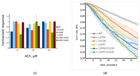Another set of the mutated muscle nAChR properties tested in fluorimetric Ca2+ assay is agonist autoinhibition at higher concentrations (Figure 4c) and cytoplasmic Ca2+ acetylcholine-evoked response decay (Figure 4d). It was reported that higher concentrations of acetylcholine are capable of inhibiting of the receptor, causing decreased responses on the right side of the dose–response curve [26,27]. In our 96-well plate setup we also observed decreased responses to 90 μM acetylcholine in muscle nAChRs bearing G153S mutation (Figure 4a,b). To investigate the Ca2+ rise with better temporal resolution than can be achieved in the plate reader we performed measurements of cytoplasmic Ca2+ rise amplitude in response to 10, 100, and 200 μM acetylcholine using epifluorescent microscope (Figure 4c). Contrary to the 96-well plate data, we did not observe drastically diminished amplitudes of acetylcholine-evoked responses, although L199A and L199A/G153S mutants tended to show decreased responses to 100 and 200 μM of acetylcholine, respectively (Figure 4c). Thus, we concluded that in our 96-well plate setup apparent acetylcholine autoinhibition in higher micromolar range is not attributed to the fluorescent response amplitude reduction. One possible explanation of apparent acetylcholine autoinhibition is the difference in Ca2+ rise kinetics, which, in combination with plate reader technical limitations of fluorescent detection speed, could cause underestimation of the response.