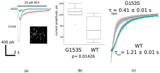 Patch-clamp electrophysiology study of WT and G153S muscle nAChR overexpressed in neuro 2a cells: (a) comparison of ionic current trace shapes of WT (light blue) and G153S (pink). Inset shows specific membrane staining with selective muscle nAChR ligand Alexa Fluor 555 α-bungarotoxin; (b) comparison of the maximal achieved acetylcholine-evoked current amplitudes for G153S and WT muscle nAChRs represented as a box-and-whisker plot. Mean amplitude of G153S mutant is slightly higher than amplitude of WT receptor at significance level p < 0.05 (two-sample t-test, n = 8); and (c) averaged (n = 8) current decay of G153S (pink) and WT (light blue) fitted with double exponential curves. Standard errors of the mean values in each time point are shown as gray shadows under the curves. Time constants of fast exponential component differ about three-fold.