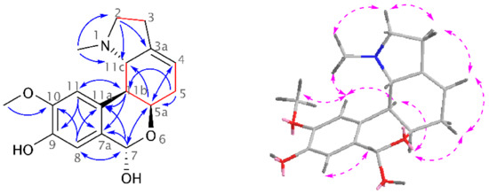 A new homolycorine-type AA, 9-O-demethyllycorenine (1), was isolated as a white amorphous solid from the mother liquor of Hippeastrum × hybridum cv. Ferrari, using preparative TLC. Since this alkaloid is a 9-O-demethyl analogue of the already described lycorenine, the name of this new substance was derived from it. The ESI-HRMS of 1 showed a molecular ion peak [M + H]+ at m/z 304.1550, corresponding to the formula C17H21NO4+ (calculated 304.1543, Figure S1). The lycorenine-type skeleton was proven in the 1H-NMR spectrum by the presence of two singlets of a 1,2,4,5-tetrasubstituted benzene ring (δH 6.94, H-8; 6.91, H-11), one deshielded singlet of a benzylic proton (δH 6.01, H-7), a multiplet of olefinic protons (δH 5.50–5.46, H-4), and so on. Compared to the resonances of three lycorenine methyls, only two signals of the methyl groups were recognized in the 1H-NMR spectrum of 1: the deshielded O-methyl (δH 3.89, s) and the methyl of the NCH3 group (δH 2.10, s) (see Figure S3, Supplementary Materials). Employing two-dimensional (2D) NMR experiments, the constitution of 1 was confirmed (Figure 1). The crucial position of the OCH3 was determined by interactions in the adiabatic gHMBC experiment (gHMBCAD) and supported by a cross-peak of its methyl protons and H-11 in the NOESY spectrum. This experiment was used for the establishment of the relative configuration as follows: the cross-peak of H-5a/H-11b in the NOESY spectrum presented in the cis position for these protons, and no through-space interaction of H-5a/H-7 and H-11b/H-11c determined H-11b/H-11c with a trans orientation. Moreover, H-11b coupled to H11c with 3J = 9.5 Hz, which corresponds to a trans-pseudo-diaxial position. Then, the absolute configuration was determined as (5aR,7S,11bS,11cS) using chiroptical methods and comparison with published data of similar compounds. The electronic circular dichroism (ECD) spectrum of 1, with negative Cotton effects at 237 nm and 282 nm, was in good agreement with that of lycorenine (see Figure S2, Supplementary Materials). The dextrorotatory value is in accordance with those found for other alkaloids possessing a lycorenine skeleton, such as lycorenine, nerinine, and oduline [9].