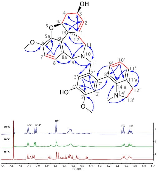 Key NMR correlations of 2 (red lines show gCOSY and gH2BC correlations, and blue arrows indicate interactions in the gHMBCAD experiment) and the aromatic region of its 1H-NMR spectrum at different temperatures, which demonstrates coalescence of highlighted signals during dynamic NMR analysis (measured in CDCl3).