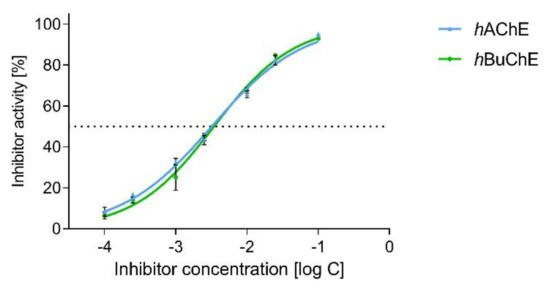 where ΔABl is the increase in absorbance of the blank sample and ΔASa is the increase in absorbance of the measured sample. The inhibition potency of the tested compounds was expressed as an IC50 value (concentration of inhibitor which causes 50% cholinesterase inhibition).
