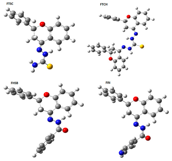 In the molecular structures of the compounds studied, one chiral center in compounds 1–4 and two chiral centers in FTCH (C-2, according to atom numbering in Figure 1) may be noticed, therefore the studied compounds may exist in the form of enantiomers. All the possible enantiomers were optimized with the use of the PM6/DFT(B3LYP) method and the obtained results indicated that the S enantiomers are about 2–3 kcal/mol more stable than the corresponding R enantiomers (Supplementary Table S1). The DFT (B3LYP)/6-31+G(d,p)/PCM (DMSO) optimized geometries of the studied molecules are presented in Figure 2, while the optimized geometrical parameters are gathered in Supplementary Materials (Figure S1, Tables S2 and S3).