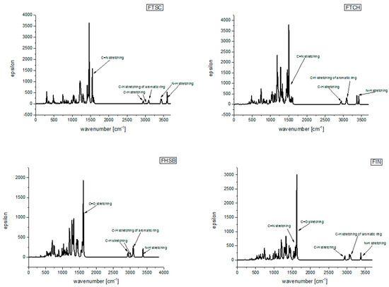 Theoretically predicted (at the density functional theory (DFT)(B3LYP)/6-31+G(d,p)/PCM(DMSO) level of theory) infra-red (IR) spectra of the studied compounds.