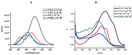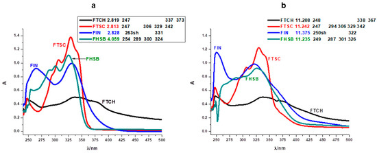 Comparison of absorption spectra of FTCH, FTSC, FIN, and FHSB in acidic (a) and alkaline (b) ranges. (Origin (Pro) software using the original files from the instrument: Perkin-Elmer Lambda 11 spectrophotometer).