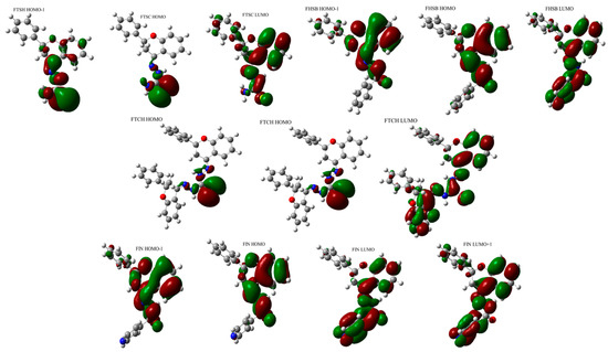 The graphical representation of orbitals participating in the lowest energy electronic transitions of FHSB, FIN, FTSC, and FTCH.
