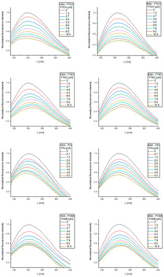 The normalized steady-state fluorescence spectra of serum albumins SAs and their changes upon addition of the ligands studied are presented in Figure 7. FTCH, FTSC, FIN, and FHSB did not show intrinsic fluorescence under the experimental conditions.